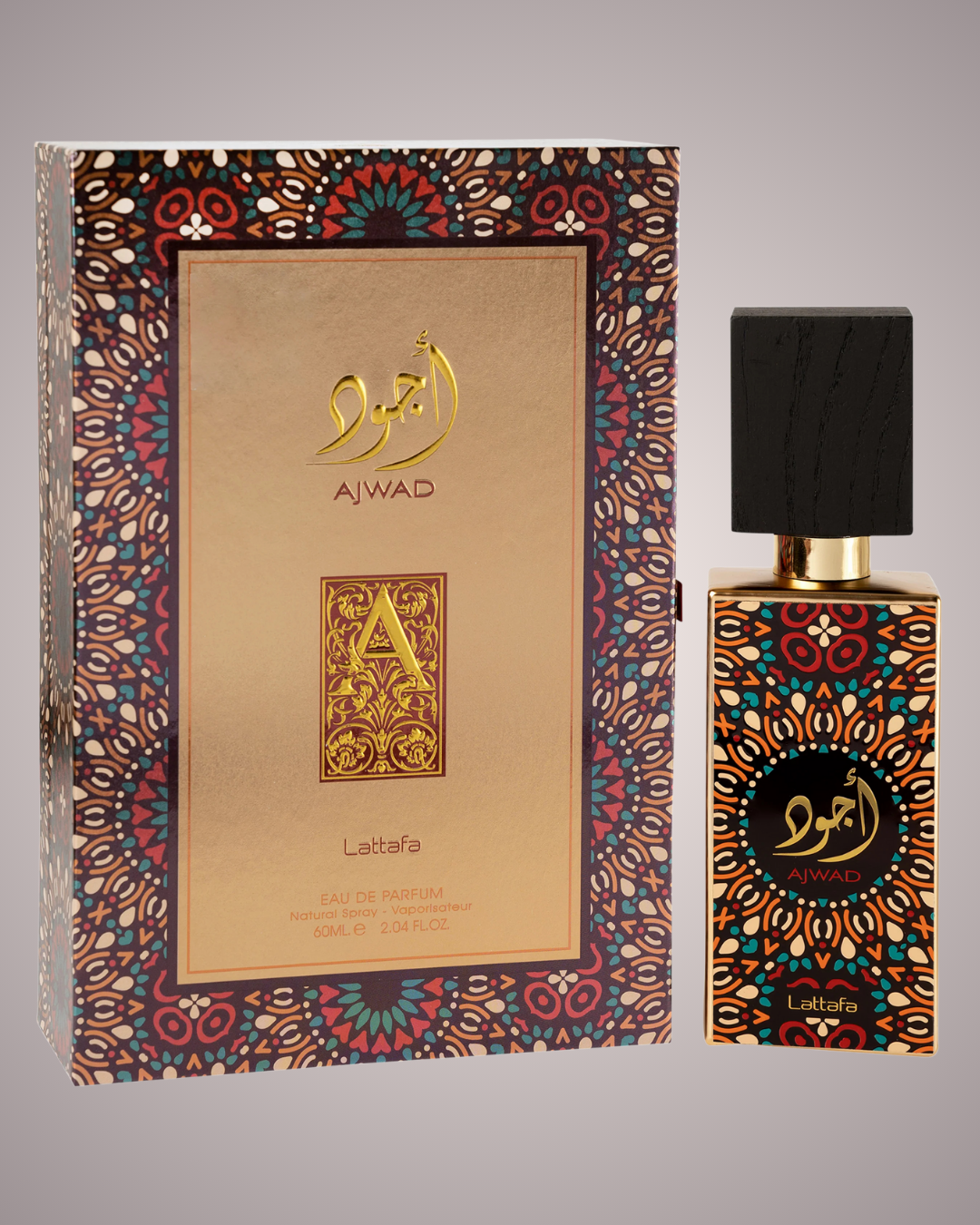 Présenté dans un flacon raffiné, orné de motifs mosaïques et surmonté d’un capuchon effet bois, AJWAD se pare d’un éclat doré symbole de luxe et d’élégance.